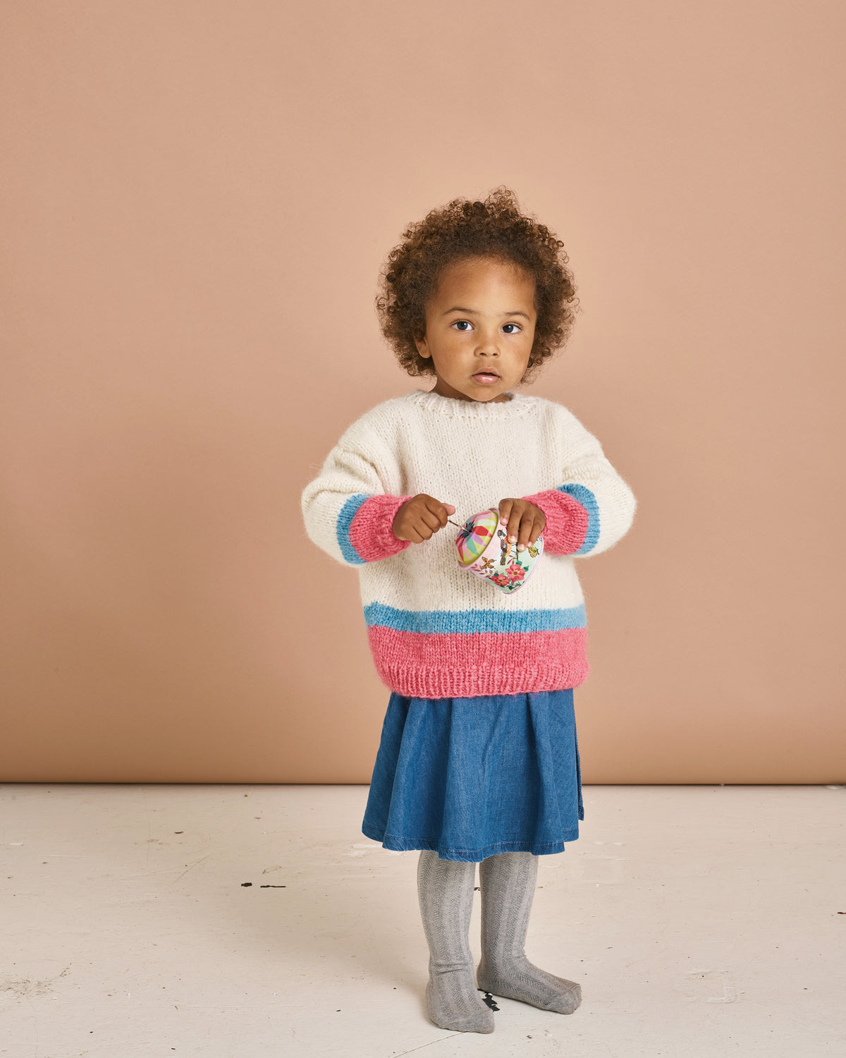 Det här mönstret ger dig en lekfull, randig barntröja med rymlig passform och mjuk känsla. Perfekt för små axlar i rörelse. Tröjan stickas nerifrån och upp, med enkla detaljer och fokus på färg – välj två toner för ett klassiskt uttryck, eller lek loss med alla restgarner i korgen.