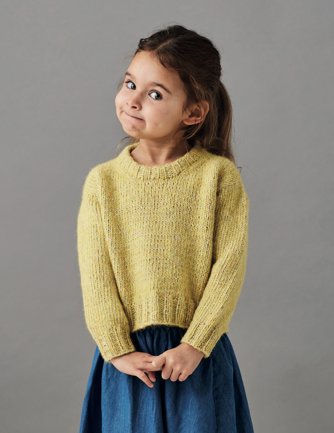 En söt och enkel stickad tröja för barn, med lång ärm och klassisk rund hals. Den stickas i ett mjukt och lätt garn som gör den både varm och behaglig att bära – perfekt för vardag, lek och utflykter.